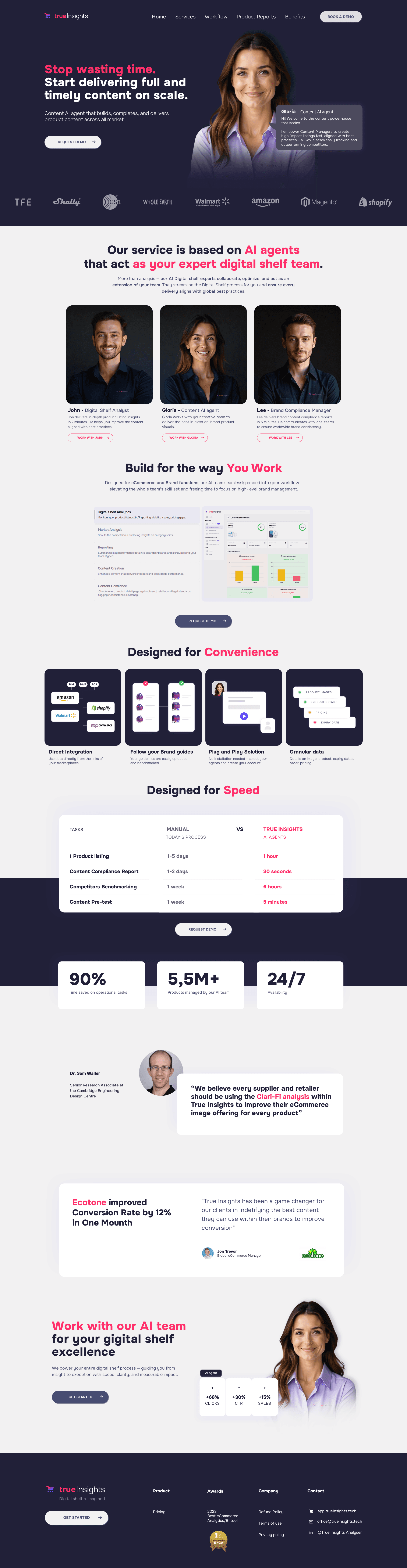 True Insights is a science-backed AI platform that acts as your expert digital shelf team, optimizing eCommerce product listings with speed and precision. Whether you’re uploading images, writing descriptions, or ensuring compliance, our AI Agents collaborate seamlessly with your existing workflows -analyzing visuals, testing conversions, and enforcing brand standards across global marketplaces.