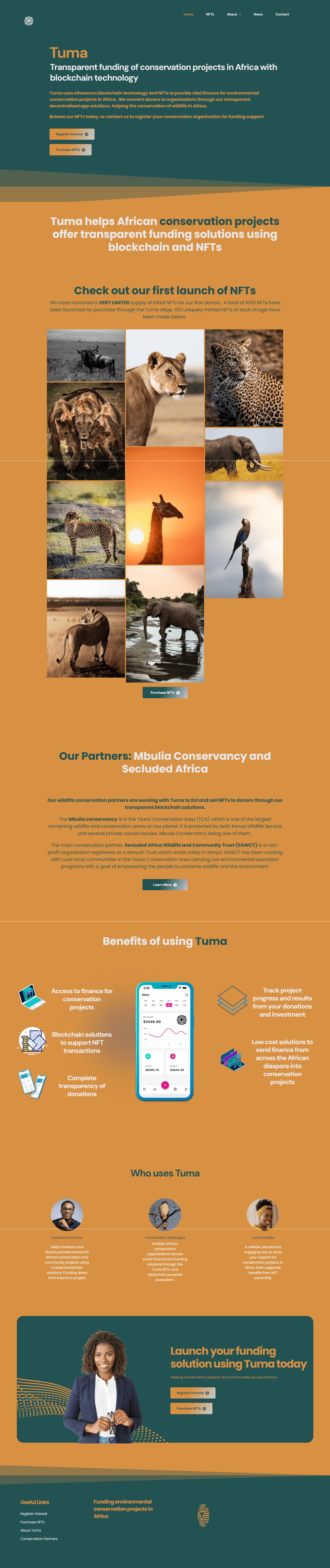Tuma is reshaping how conservation projects in Africa access funding by combining blockchain technology and NFTs with real-world environmental impact. Our platform empowers local organizations to raise transparent, traceable funds while connecting global supporters to conservation efforts they can believe in. With every NFT or donation, you're contributing to a more secure future for Africa's wildlife and ecosystems. We believe that protecting Africa’s natural heritage requires global collaboration, transparency, and innovative funding. Tuma bridges the gap between technology and conservation to make that vision a reality.